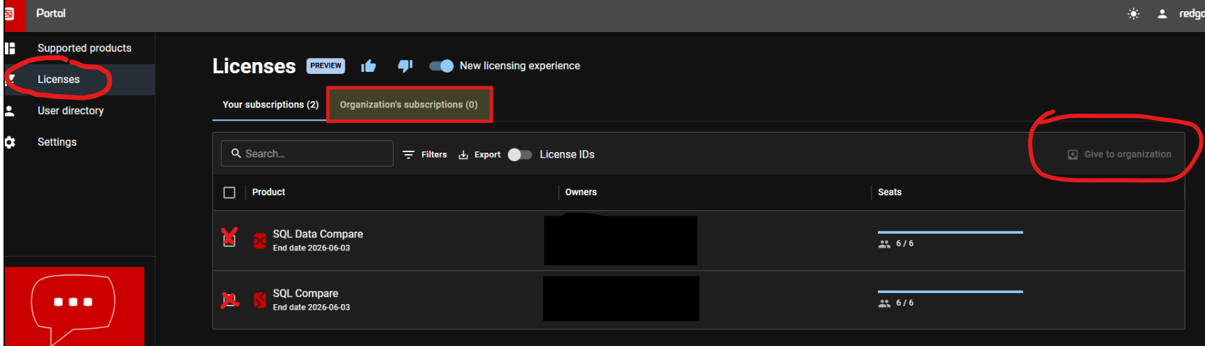 Select the licenses you wish to add by checking the box, then click Give to organization.