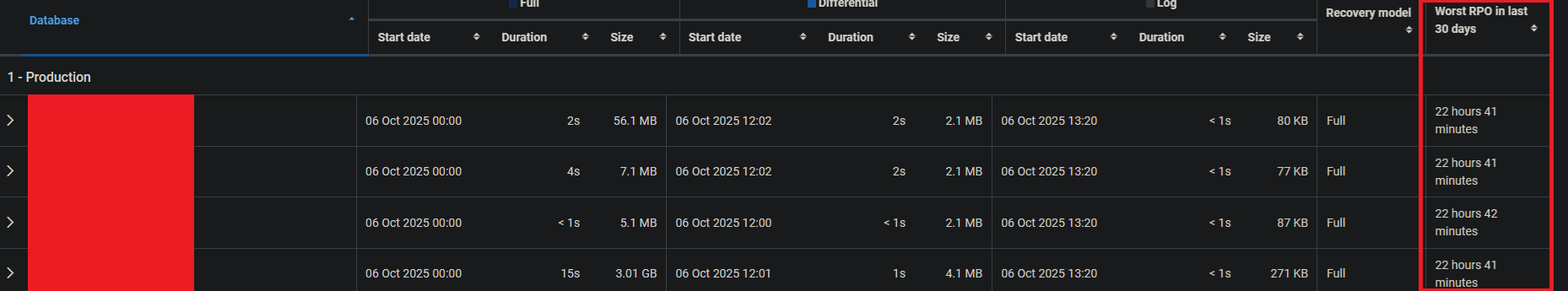 Does anyone know the logic behind this and how I can see where that worst RPO is coming from (What day etc) as all I can see in my environment of note in the last 30 days is that 2 diff backups failed, which makes me think I may have a rogue backup not being set as COPY_ONLY, or similar, though I haven't been able to find anything