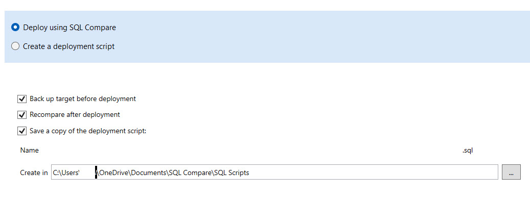I created one in File > Create Scripts. When I go to do the Deploy, it comes up with the Redgate default value, ignoring what I set up. I scripts to go into C:/Development/Redgate_Scripts