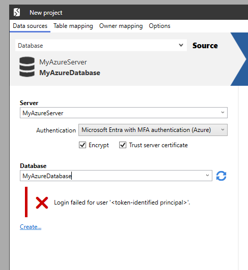 Update. Don't waste your time with the refresh icon to test the connection like you do with on-prem. Just put in your servername and DB and hit compare. It will have you auth your entra ID and it will work. The error above is misleading. Would be nice to see fixed, but you can ignore the error and compare works fine.