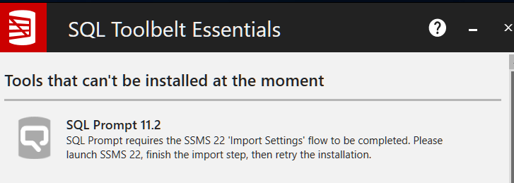 I installed SSMS 22 and completed the import settings process. However, when I attempted to install SQL Prompt 11.2, I encountered an error. Could you advise on possible solutions?