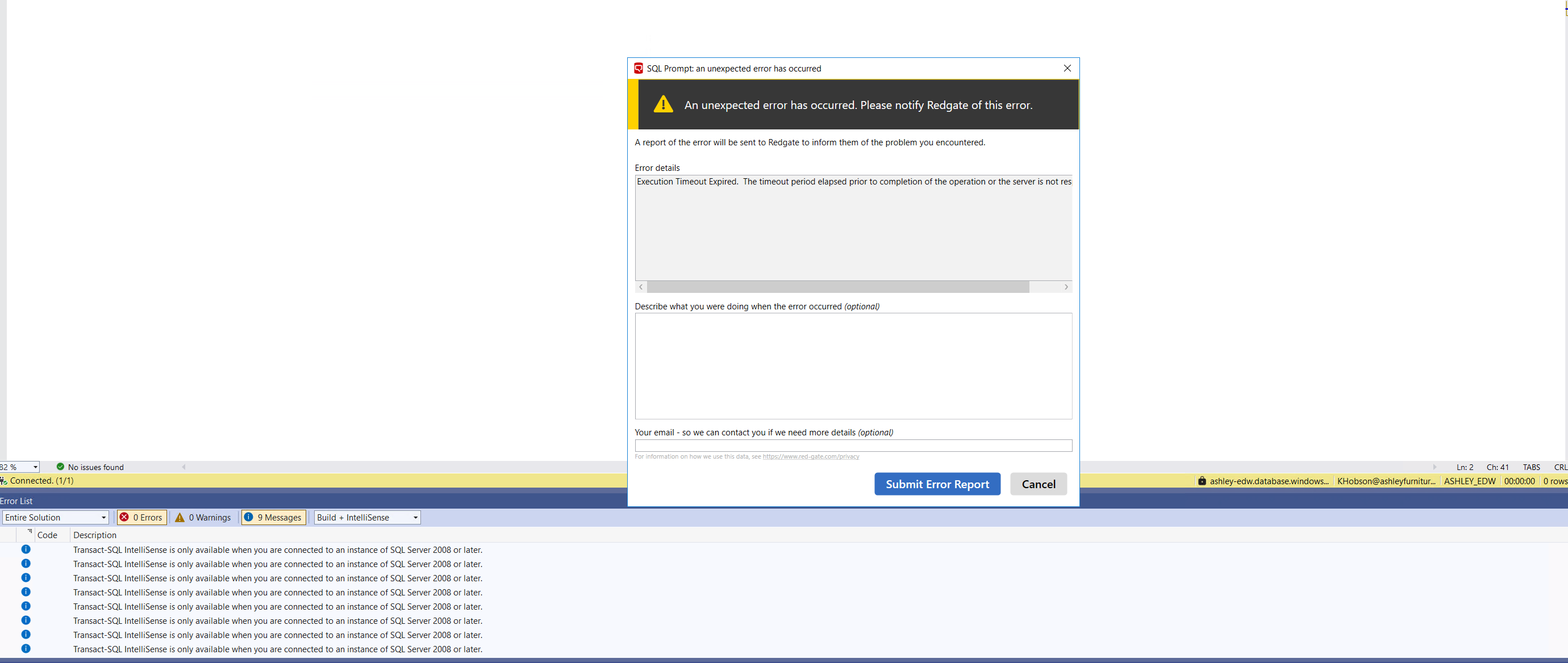 why does this error box keep popping up ever since I upgraded my ssms. I am using redgate sql prompt on sql server 21.5.14