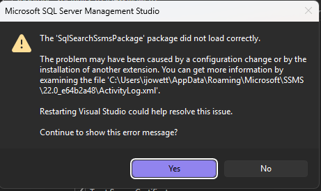 Same here with SSMS 22.3.0 and latest SQL Search 3.9.